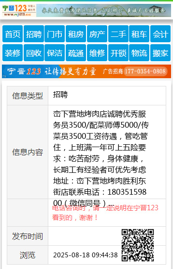 峦下营地烤肉店诚聘优秀服务员3500/配菜师傅5000/传菜员3500
