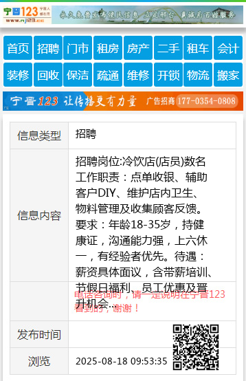 招聘岗位:冷饮店(店员)数名
