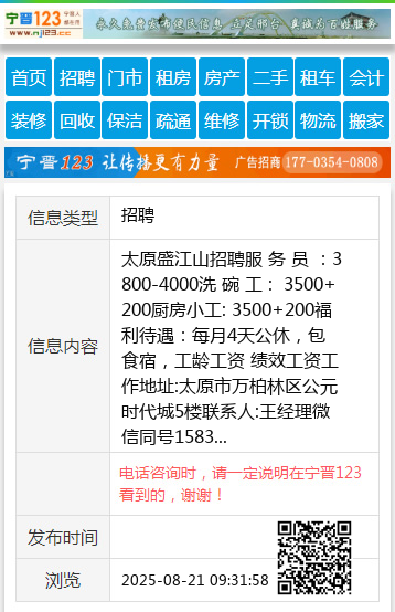 | 防骗提醒: | 太原生活网(www.sxtaiyuan.net)提醒您:手工活、网络兼职、刷单,都是骗子!凡以各种名义收取费用的都是骗子!找工作是往兜里挣钱,让你往外掏钱的都是骗子!异地招聘请提高警惕,谨防诈骗! |