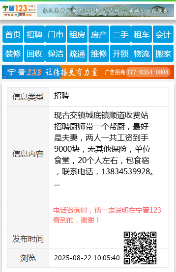 现古交镇城底镇顺道收费站招聘厨师带一个帮厨,最好是夫妻,两人一共工资到手9000块,无其他保险,单位食堂,20个人左右,包食宿,联系电话,13834539928。 【电话咨询时,请一定说明在太原生活网看到的,谢谢!】 |