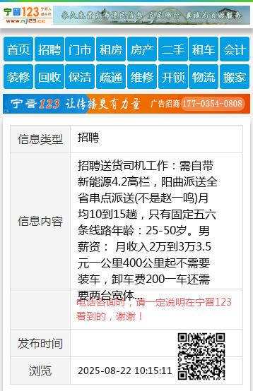 工作:需自带新能源4.2高栏,阳曲派送全省串点派送(不是赵一鸣)月均10到15趟,只有固定五六条线路