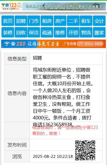 坞城东街附近单位,招聘做职工餐的厨师一名,不提供住宿。大概10月份开始上班。
