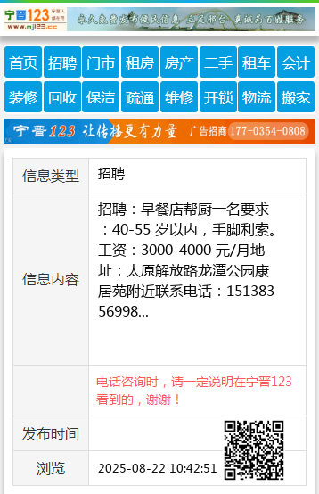 | 防骗提醒: | 太原生活网(www.sxtaiyuan.net)提醒您:手工活、网络兼职、刷单,都是骗子!凡以各种名义收取费用的都是骗子!找工作是往兜里挣钱,让你往外掏钱的都是骗子!异地招聘请提高警惕,谨防诈骗! |