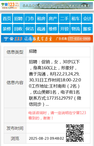 招聘:促销,女,30岁以下,身高160以上,形象好,善于沟通,8月22,23,24,29,30,31日