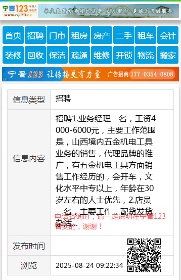 2.店员一名,主要工作,配货发货杂活等,联系电话.13903415048,地址:太原市万柏林区西中环北口巍进基础公司院内 【电话咨询时,请一定说明在太原生活网看到的,谢谢!】 |