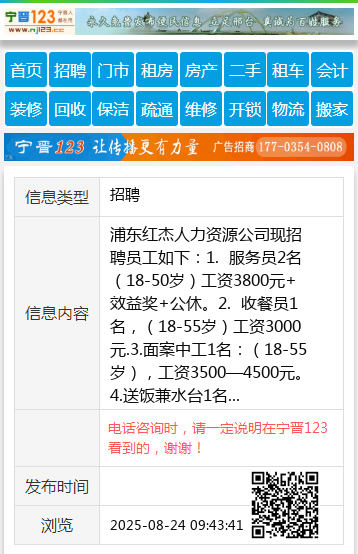1. 服务员2名(18-50岁)工资3800元+效益奖+公休。
