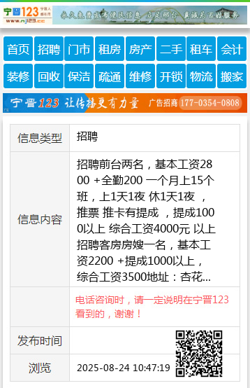 招聘客房房嫂一名,基本工资2200 +提成1000以上,综合工资3500