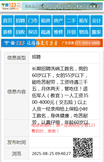 洗碗工数名,男的60岁以下,女的55岁以下,能吃苦耐劳,工资待遇三千五,月休两天,管吃住!