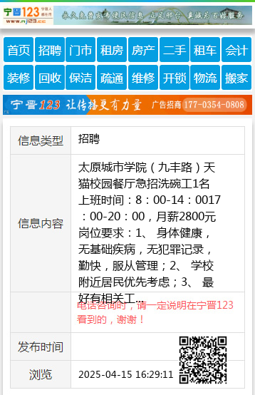 太原城市学院(九丰路)天猫校园餐厅急招洗碗工1名上班时间: