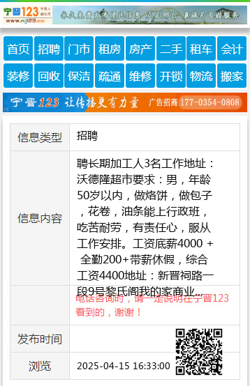 聘长期加工人3名 工作地址:沃德隆超市 要求:男,年龄50岁以内,做烙饼,做包子,花卷,油条能上行政班,吃苦耐劳,有责任心,服从工作安排。 工资底薪4000 + 全勤200+带薪休假,综合工资4400 地址:新晋祠路一段9号黎氏阁我的家商业广场二楼沃德隆超市。 有意者联系:18335920530