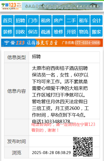 太原市府西街桔子酒店招聘保洁员一名,女性,60岁以下均可来工作。