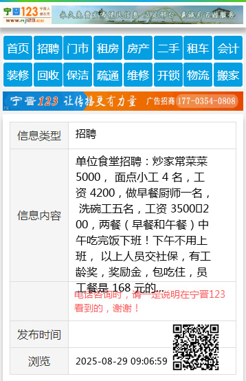 单位食堂招聘:炒家常菜菜 5000, 面点小工 4 名,工资 4200,做早餐厨师一名, 洗碗工五名,工资 3500➕200,两餐(早餐和午餐)中午吃完饭下班!下午不用上班, 以上人员交社保,有工龄奖,奖励金,包吃住,员工餐是 168 元的自助餐,联系电话 15635788499 【电话咨询时,请一定说明在太原生活网看到的,谢谢!】 |