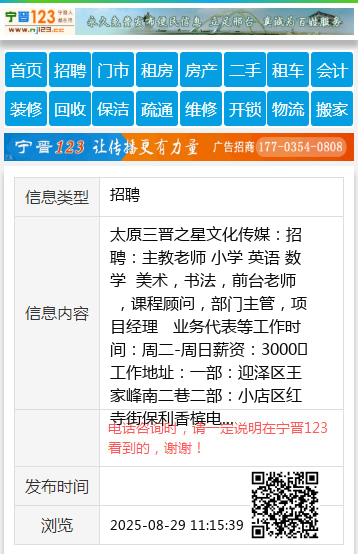 太原三晋之星文化传媒:招聘:主教老师 小学 英语 数学 美术,书法,前台老师 ,课程顾问,部门主管,项目经理 业务代表等 工作时间:周二-周日 薪资:3000➕ 工作地址: 一部:迎泽区王家峰南二巷 二部:小店区红寺街保利香槟 电话:13934624157霍老师 地址:富力天禧城 年龄:25-45岁 工作要求:理疗师 联系电话:17696091135 |