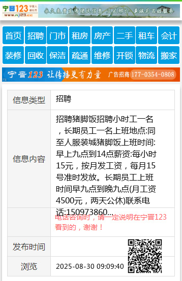 上班时间:早上九点到14点薪资:每小时15元,按月发工资,每月15号准时发放。