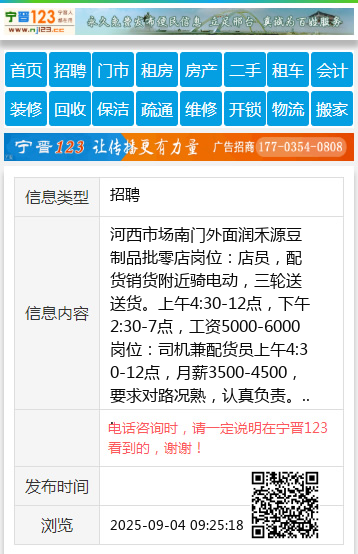 润禾源豆制品批零店岗位:店员,配货销货附近骑电动,三轮送送货。