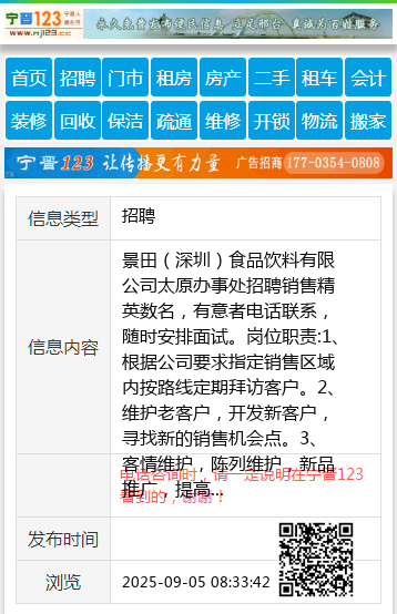 景田(深圳)食品饮料有限公司太原办事处招聘销售精英数名,有意者电话联系,随时安排面试。 岗位职责: 1、根据公司要求指定销售区域内按路线定期拜访客户。 2、维护老客户,开发新客户,寻找新的销售机会点。 3、客情维护,陈列维护,新品推广,提高市场铺货率。 4、及时传达公司政策和其他活动。 5、主要负责品牌:百岁山、景田 岗位要求: 1.一年以上快消品工作经验。 2.20—35周岁,男女不限。 3.工作责任心强,能吃苦耐劳,会开车优先。 薪资待遇: 1.基本工资底薪+奖金+五险一金+销售提成(上不封顶),综合工资6000元以上。 2.入职缴纳五险一金,周日单休。 3.招聘区域:太原市全区域。 4.职位福利:带薪年假、法定节假日休息。 5.晋升空间:业务代表-销售主管。 联系电话:13935116211 |