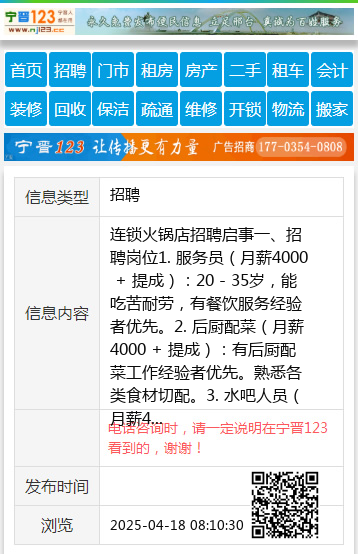1. 服务员(月薪4000 + 提成):20 - 35岁,能吃苦耐劳,有餐饮服务经验者优先。