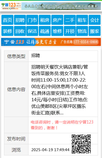 招聘明天餐饮火锅店兼职/管饭 传菜服务员:男女不限3人 时间11:00-15:00,17:00-22:00左右 (中间休息两个小时左右,具体店里安排) 工资费用: 14元/每小时(日结) 工作地点:优山美郡B区(尖草坪区摄乐街金汇路) 联系电话17636566870同微信