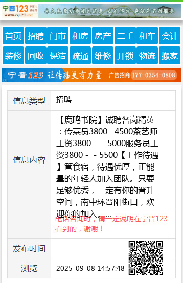 【鹿鸣书院】 诚聘各岗精英: 传菜员3800--4500 茶艺师工资3800--5000 服务员工资3800--5500 【工作待遇】管食宿,待遇优厚,正能量的年轻人加入团队。只要足够优秀,一定有你的晋升空间,南中环晋阳街口,欢迎你的加入。 ☎ 13753488320