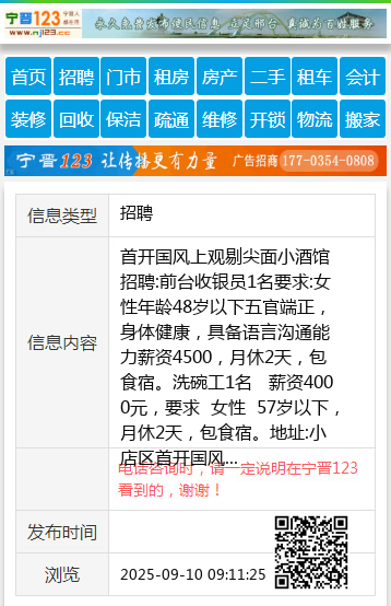 首开国风上观剔尖面小酒馆 招聘:前台收银员1名要求:女性年龄48岁以下五官端正,身体健康,具备语言沟通能力 薪资4500,月休2天,包食宿。洗碗工1名 薪资4000元,要求 女性 57岁以下,月休2天,包食宿。 地址:小店区首开国风上观南门 联系电话15536687431微信同号