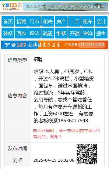 求职:本人男,43周岁,C本,开过4.2米高栏,小型箱货,面包车,送过米面粮油,跑过物流,5年实际驾龄,会用导航,想找个管吃管住,每月有休息开车送货的工作,工资6000左右,有需要的老板联系18636017948