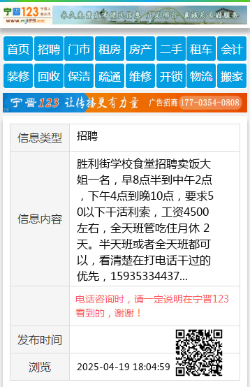胜利街学校食堂招聘卖饭大姐一名,早8点半到中午2点,下午4点到晚10点,要求50以下干活利索,工资4500左右,全天班管吃住月休 2天。半天班或者全天班都可以,看清楚在打电话干过的优先,15935334437