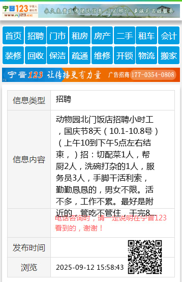 动物园北门饭店招聘小时工,国庆节8天(10.1-10.8号)(上午10到下午5点左右结束,) 招:切配菜1人,帮厨2人,洗碗打杂的1人,服务员3人, 手脚干活利索,勤勤恳恳的,男女不限。 活不多,工作不累。最好是附近的, 管吃不管住,干完8天结工资。 手机18295822626 13623452759
