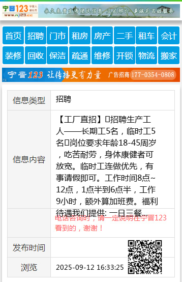 【工厂直招】 ☑招聘生产工人——长期工5名,临时工5名☑ 岗位要求年龄18-45周岁,吃苦耐劳,身体康健者可放宽。临时工连做优先,有事请假即可。 工作时间8点~12点,1点半到6点半,工作9小时,额外算加班费。 福利待遇我们提供: 一日三餐➕免费住宿➕全勤奖➕工龄奖➕绩效奖➕节日福利➕商业险 岗位薪资长期女工2700~4000元;长期男工3500~5000元;临时工90元~100元/天。 工作地址太原市小店区南马村工业园区 ☎联系方式15735046423/13935196159 |