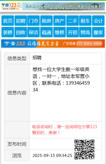 想找一位大学生教一年级英语,一对一,地址老军营小区,联系电话:13934645934