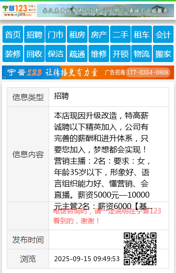 本店现因升级改造,特高薪诚聘以下精英加入,公司有完善的薪酬和进升体系,只要您加入,梦想都会实现! 营销主播:2名: 要求:女,年龄35岁以下,形象好、语言组织能力好、懂营销、会直播。 薪资5000元—10000元 主管2名:薪资6000【基本工资+绩效奖励】 收银员2名:薪资4500【基本工资+绩效奖励】 服务员10名:薪资4500 传菜员8名: 薪资4500 保洁员2名: 薪资4500 厨房各岗位 【炒锅、面案、凉菜、粘板、打荷、洗碗工等招聘中】 薪酬4000——8000 【基本工资+绩效奖励】 小时工、短期工、假期工长期招聘中! 员工福利:包食宿,员工团建,生日礼品,薪资晋级等 热线:孙总:18135287198 |