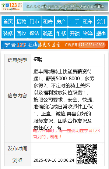 顺丰同城骑士快递员 薪资待遇 1、薪资5000-8000,多劳多得 2、不定时的骑士关怀以及福利发放 岗位职责: 1、按照公司要求,安全、快捷、准确的完成日常收 派件工作; 1、正直、诚信,具备良好的服务意识、团队合作意识及责任心; 2、有服务行业经验者优先; 3、年龄要求:18-55岁; 联系电话19935376039 工作地址 南内环街 长治路 建设路 |
