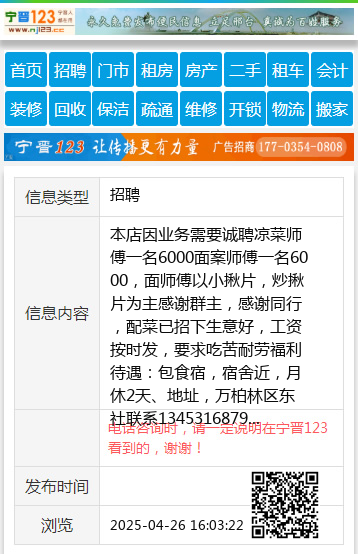 本店因业务需要诚聘 凉菜师傅一名6000 面案师傅一名6000,面师傅以小揪片,炒揪片为主 感谢群主,感谢同行,配菜已招下 生意好,工资按时发,要求吃苦耐劳 福利待遇:包食宿,宿舍近,月休2天、 地址,万柏林区东社 联系13453168790李(微信同号)