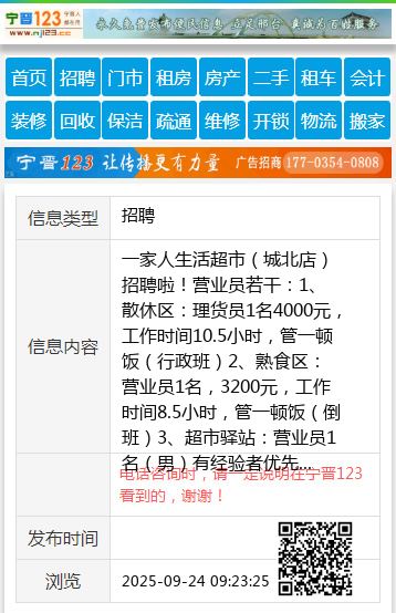 3、超市驿站:营业员1名(男)有经验者优先考虑,4000元,工作8.5小时,管一顿饭