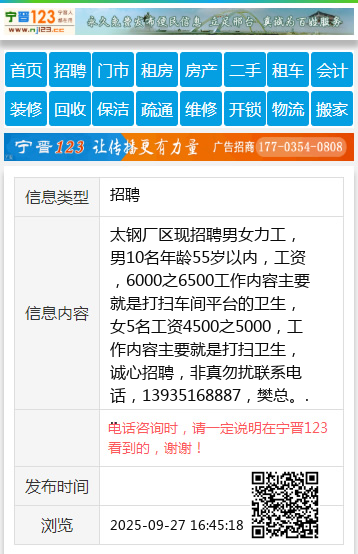 太钢厂区现招聘男女力工,男10名年龄55岁以内,工资,6000之6500