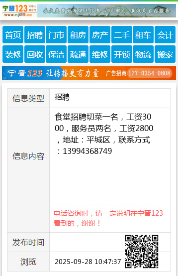 食堂招聘切菜一名,工资3000,服务员两名,工资2800,地址:平城区,联系方式:13994368749 【电话咨询时,请一定说明在太原生活网看到的,谢谢!】 |