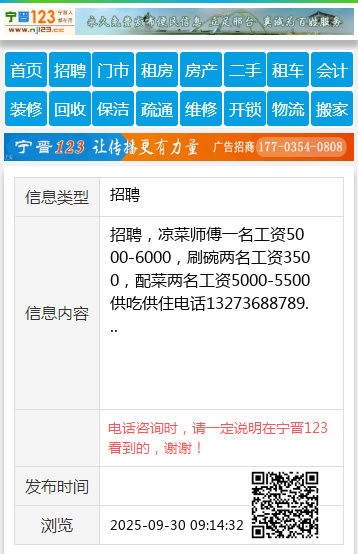招聘,凉菜师傅一名工资5000-6000,刷碗两名工资3500,配菜两名工资5000-5500供吃供住电话13273688789 【电话咨询时,请一定说明在太原生活网看到的,谢谢!】 |