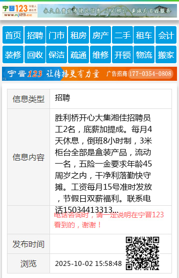胜利桥开心大集湘佳招聘员工2名,底薪加提成。
