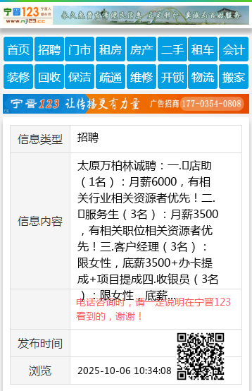 以上职位及相关待遇绝对真实可靠,正规绿色,有意请及时联系我! 【电话咨询时,请一定说明在太原生活网看到的,谢谢!】 |