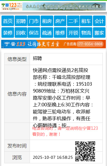 快递网点需投递员2名