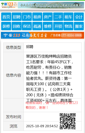晋源区万佳购烤鸭店招聘员工1名