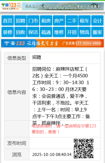 招聘岗位:麻辣拌店帮工(2名)全天工:一个月4500