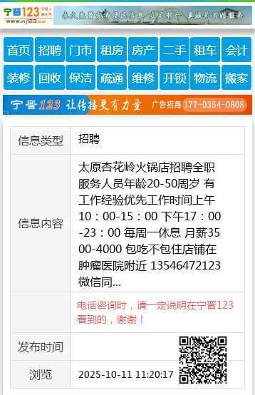 | 防骗提醒: | 太原生活网(www.sxtaiyuan.net)提醒您:手工活、网络兼职、刷单,都是骗子!凡以各种名义收取费用的都是骗子!找工作是往兜里挣钱,让你往外掏钱的都是骗子!异地招聘请提高警惕,谨防诈骗! |