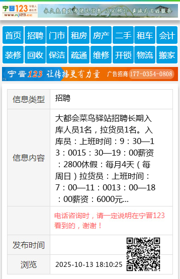 大都会菜鸟驿站招聘长期入库人员1名,拉货员1名。