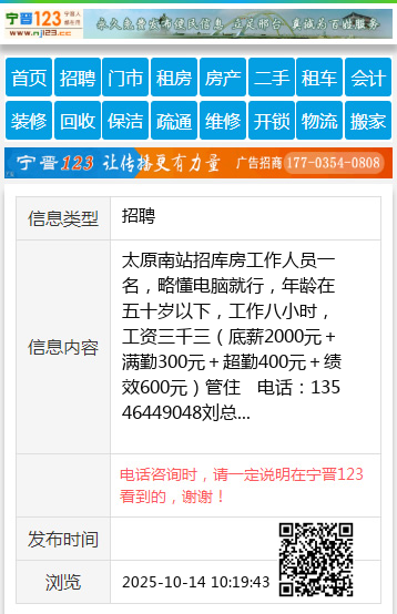 太原南站招库房工作人员一名,略懂电脑就行,年龄在五十岁以下,工作八小时,工资三千三(底薪2000元+满勤300元+超勤400元+绩效600元)管住 电话:13546449048刘总 【电话咨询时,请一定说明在太原生活网看到的,谢谢!】 |