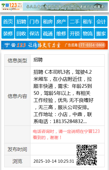 招聘 C本司机3名,驾驶4.2米厢车,在小店附近住,拉顺丰快递,需求: 年龄25到50,驾龄5年以上,有相关工作经验,优先 无不良嗜好,无三高,服从公司安排。工作地址:小店,中鼎,联系电话:18135284832 【电话咨询时,请一定说明在太原生活网看到的,谢谢!】 |