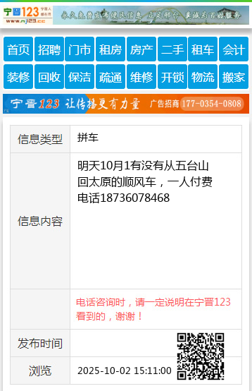 明天10月1有没有从五台山回太原的顺风车,一人付费电话18736078468