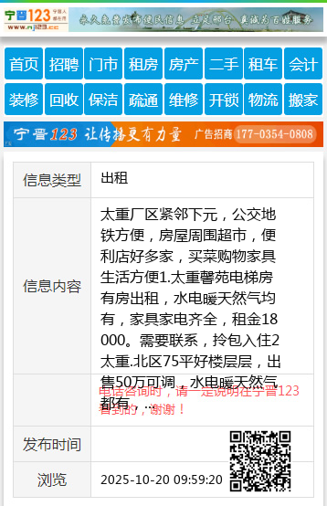 1.太重馨苑电梯房有房出租,水电暖天然气均有,家具家电齐全,租金18000。需要联系,拎包入住