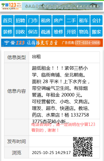 超低租金!!!紧邻三桥小学、临街商铺、坐北朝南。面积 28 平米!上下水齐全,带空调暖气卫生间。有排烟管道。年租金 20000 元。 可经营餐饮、小吃、文具店。理发、超市、快递店。教培、药店、水果店!