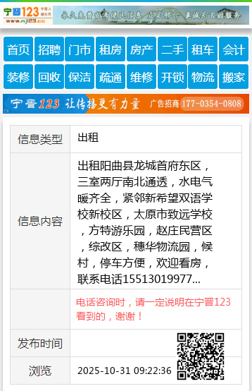 出租阳曲县龙城首府东区,三室两厅南北通透,水电气暖齐全,紧邻新希望双语学校新校区,太原市致远学校,方特游乐园,赵庄民营区,综改区,穗华物流园,候村,停车方便,欢迎看房,联系电话15513019977 【电话咨询时,请一定说明在太原生活网看到的,谢谢!】 |