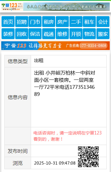 出租 小井峪万柏林一中斜对面小区一套楼房。一层两室一厅72平米 电话17735134689